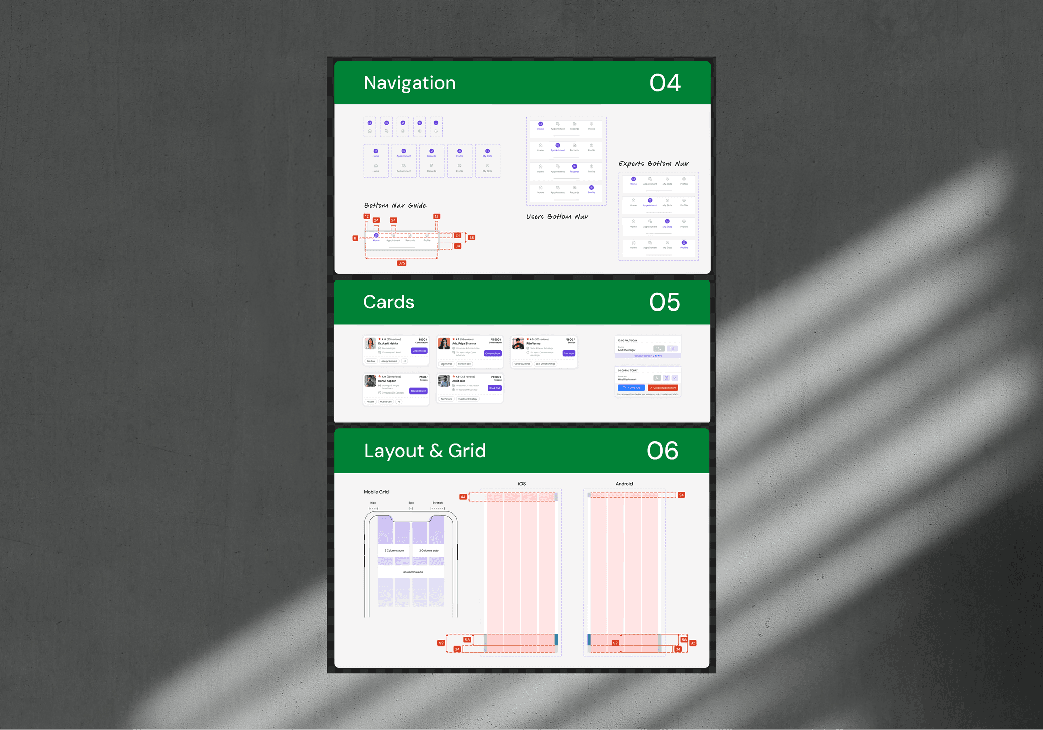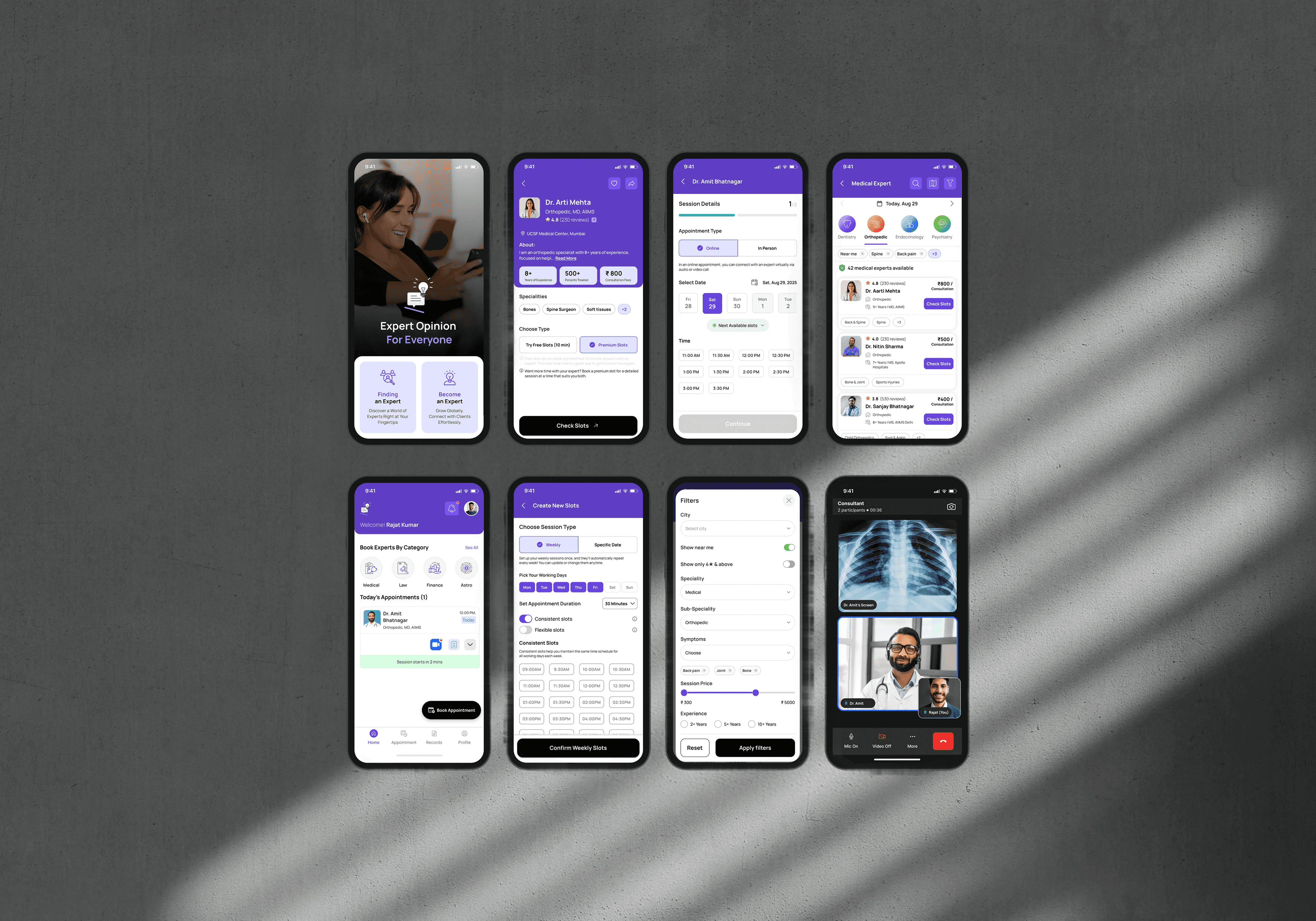 Designed key interfaces including expert discovery, profile evaluation, booking flow, dashboards, and slot management